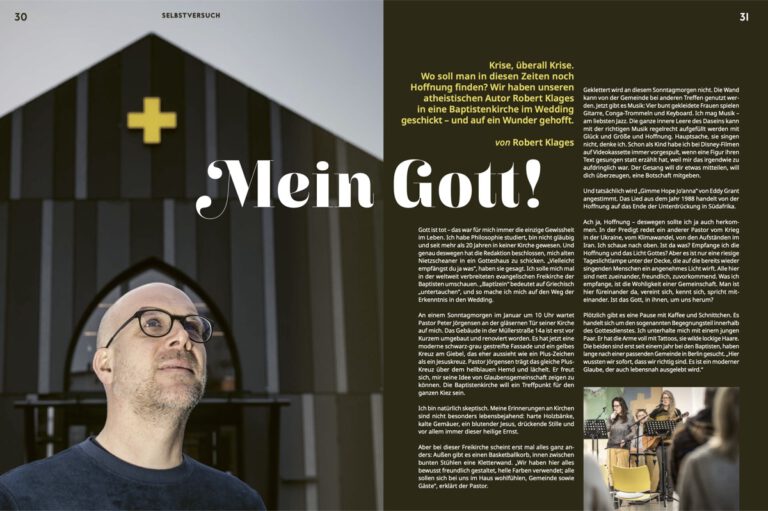 „Hallo Nachbar“ ist das Mietermagazin der GESOBAU und erscheint seit 1992. Unter der Überschrift „Selbstversuch“ schaut der Reporter Robert Klages regelmäßig über den Tellerrand und erkundet Angebote in den Mieterkiezen der Wohnungsbaugesellschaft. Im Januar waren wir als Gemeinde Schauplatz dieses Selbstversuchs.